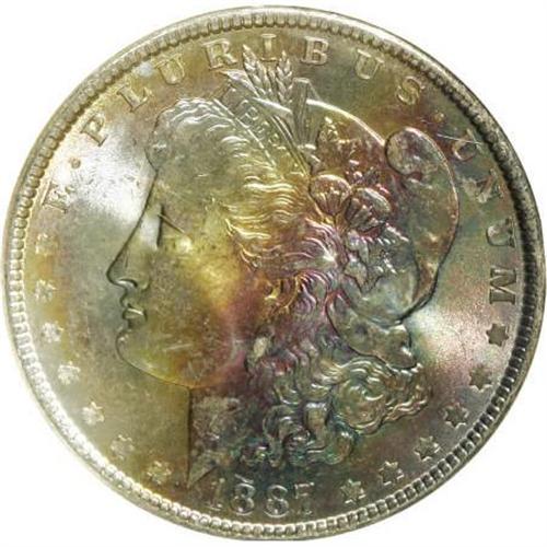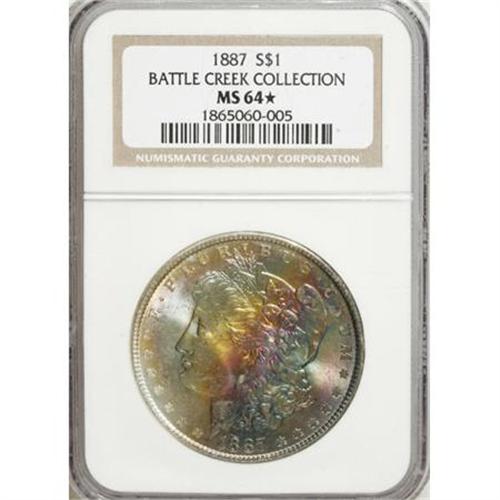 <B>1887 $1 MS64</B></I><img src="/images/star.gif" width="10" height="10" alt="" border="0"><B> NGC.</B></I> Ex: Battlecreek Collection. NGC Census: (55957/22478). PCGS Population (40295/13662). Mintage: 20,290,710. Numismedia Wsl. Price for NGC/PCGS coin in MS64: $45. (#7172)<BR><BR><B>Coin Engraver:</B> George T. Morgan<BR><BR><b>Shipping:</b> Coins & Currency (<a target="_blank" href="http://www.heritageauctions.com/common/shipping.php">view shipping information</a>)