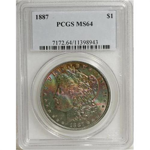 <B>1887 $1 MS64 PCGS.</B></I> Well-defined with excellent luster, an attractive Choice example of this Philadelphia issue. The obverse offers a delightful melange of emerald, magenta, ocean-blue, and orange patina, while the reverse is essentially untoned.<BR><BR><B>Coin Engraver:</B> George T. Morgan<BR><BR><b>Shipping:</b> Coins & Currency (<a target="_blank" href="http://www.heritageauctions.com/common/shipping.php">view shipping information</a>)
