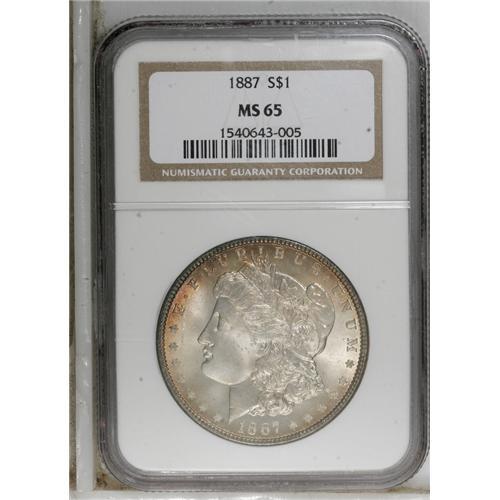 <B>1887 $1 MS65 NGC.</B></I> NGC Census: (19012/2953). PCGS Population (12441/1104). Mintage: 20,290,710. Numismedia Wsl. Price for NGC/PCGS coin in MS65: $123. (#7172)<BR><BR><b>Shipping:</b> Coins & Currency (<a target="_blank" href="http://www.heritageauctions.com/common/shipping.php">view shipping information</a>)