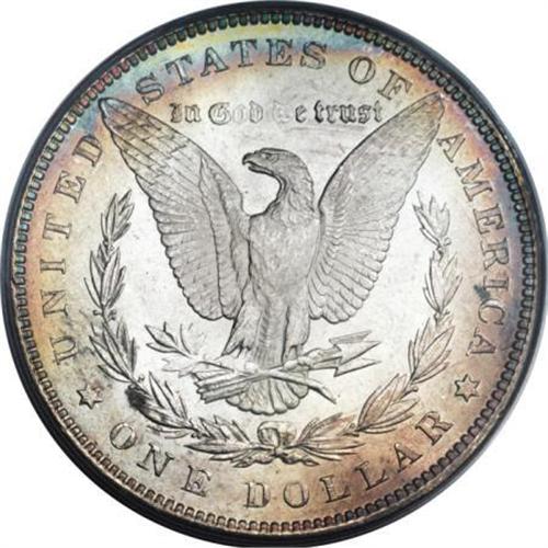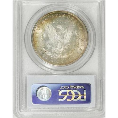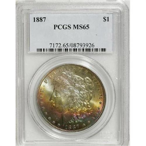 <B>1887 $1 MS65 PCGS.</B></I> Rainbow toned Morgan dollars like this one are always in demand from numismatists and when they are as beautiful as this one, it is easy to see why. Electric magenta, yellow, emerald, and pastel hues of lilac and baby-blue overwhelm the obverse while the reverse has a single sliver of rainbow color circling the rim and is otherwise brilliant. <BR><BR><B>Coin Engraver:</B> George T. Morgan<BR><BR><b>Shipping:</b> Coins & Currency (<a target="_blank" href="http://www.heritageauctions.com/common/shipping.php">view shipping information</a>)