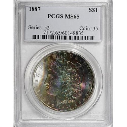 <B>1887 $1 MS65 PCGS.</B></I> A medley of green, purple, yellow-gold, and gray bathes the obverse of this Gem, though the reverse has just a sliver of toning at the right rim. Well struck with highly lustrous surfaces revealing just a few small marks and a faint fingerprint near ONE.<BR><BR><B>Coin Engraver:</B> George T. Morgan<BR><BR><b>Shipping:</b> Coins & Currency (<a target="_blank" href="http://www.heritageauctions.com/common/shipping.php">view shipping information</a>)