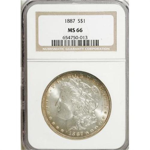<B>1887 $1 MS66 NGC.</B></I> NGC Census: (2811/213). PCGS Population (1088/56). Mintage: 20,290,710. Numismedia Wsl. Price for NGC/PCGS coin in MS66: $360. (#7172)<BR><BR><B>Coin Engraver:</B> George T. Morgan<BR><BR><b>Shipping:</b> Coins & Currency (<a target="_blank" href="http://www.heritageauctions.com/common/shipping.php">view shipping information</a>)