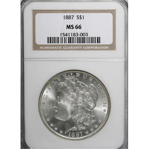 <B>1887 $1 MS66 NGC.</B></I> NGC Census: (2829/213). PCGS Population (1106/56). Mintage: 20,290,710. Numismedia Wsl. Price for NGC/PCGS coin in MS66: $360. (#7172)<BR><BR><B>Coin Engraver:</B> George T. Morgan<BR><BR><b>Shipping:</b> Coins & Currency (<a target="_blank" href="http://www.heritageauctions.com/common/shipping.php">view shipping information</a>)