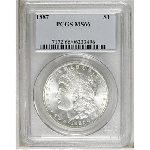 <B>1887 $1 MS66 PCGS.</B></I> PCGS Population (1037/58). NGC Census: (2753/209). Mintage: 20,290,710. Numismedia Wsl. Price for NGC/PCGS coin in MS66: $380. (#7172)<BR><BR><b>Shipping:</b> Coins & Currency (<a target="_blank" href="http://www.heritageauctions.com/common/shipping.php">view shipping information</a>)
