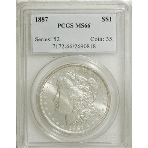 <B>1887 $1 MS66 PCGS.</B></I> PCGS Population (1037/58). NGC Census: (2753/209). Mintage: 20,290,710. Numismedia Wsl. Price for NGC/PCGS coin in MS66: $360. (#7172)<BR><BR><b>Shipping:</b> Coins & Currency (<a target="_blank" href="http://www.heritageauctions.com/common/shipping.php">view shipping information</a>)