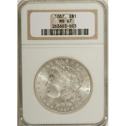 <B>1887 $1 MS67 NGC.</B></I> Aside from a light scattering of haze in the reverse fields, the shining surfaces are essentially untoned. A solidly struck example of this Philadelphia issue, from a series that had picked up an assortment of colorful monikers during its decade of existence.<BR><I>From The Vanek Collection.</B></I><BR><BR><b>Shipping:</b> Coins & Currency (<a target="_blank" href="http://www.heritageauctions.com/common/shipping.php">view shipping information</a>)