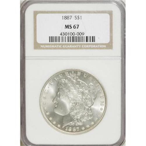 <B>1887 $1 MS67 NGC.</B></I> A sensational piece with bright silver surfaces, accented by a hint of gold along the obverse border. The surfaces are pristine and mark-free. An amazing coin that ranks among the finest surviving 1887 Morgan dollars. NGC has only certified two finer pieces (12/07).<BR><BR><B>Coin Engraver:</B> George T. Morgan<BR><BR><b>Shipping:</b> Coins & Currency (<a target="_blank" href="http://www.heritageauctions.com/common/shipping.php">view shipping information</a>)