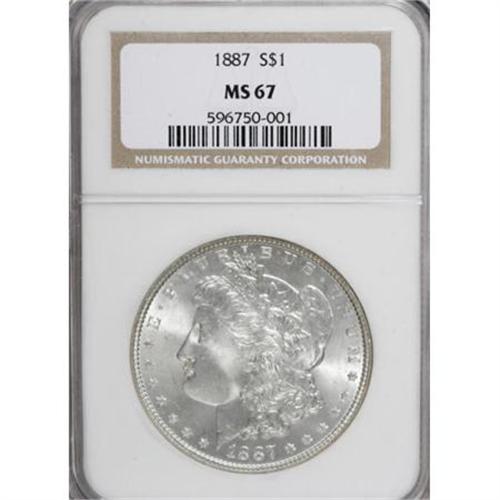 <B>1887 $1 MS67 NGC.</B></I> Fully lustrous surfaces display just a wisp or two of light obverse color under magnification. Both sides are adequately struck and impeccably preserved.<BR><BR><B>Coin Engraver:</B> George T. Morgan<BR><BR><b>Shipping:</b> Coins & Currency (<a target="_blank" href="http://www.heritageauctions.com/common/shipping.php">view shipping information</a>)
