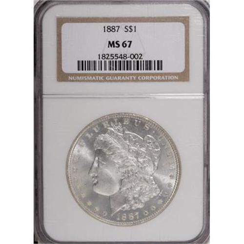 <B>1887 $1 MS67 NGC.</B></I> This sharply struck Superb Gem offers spectacular eye appeal. Its strongly lustrous and minimally toned surfaces show distinct elements of reflectivity. NGC has graded only two numerically finer pieces (1/08).<BR><BR><B>Coin Engraver:</B> George T. Morgan<BR><BR><b>Shipping:</b> Coins & Currency (<a target="_blank" href="http://www.heritageauctions.com/common/shipping.php">view shipping information</a>)