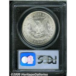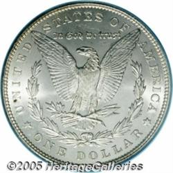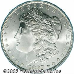 <B>1887<img border='0' src='http://www.heritagecoins.com/images/star.gif' width=10 height=10>$1 MS67 PCGS.</B></I> This is a fully brilliant, Superb quality Gem example with frosty silver luster and no indication of toning on either side. The reverse has a tiny spot at the N of UNITED. Population: 44 in 67, 1 finer (2/05).