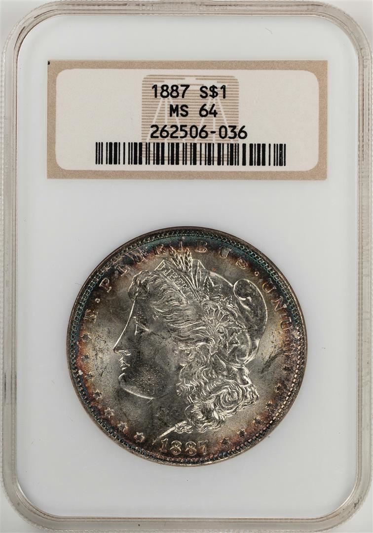 One 1887 $1 Morgan Silver Dollar Coin NGC MS64 Nice Toning. NGC Certified.