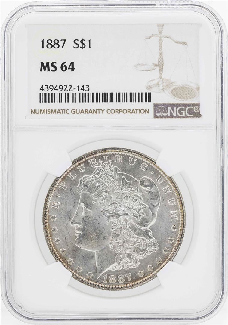 One 1887 $1 Morgan Silver Dollar Coin NGC MS64. NGC Certified.
