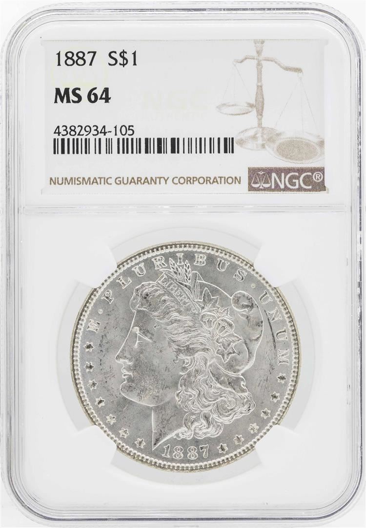 One 1887 $1 Morgan Silver Dollar Coin NGC MS64. NGC Certified.