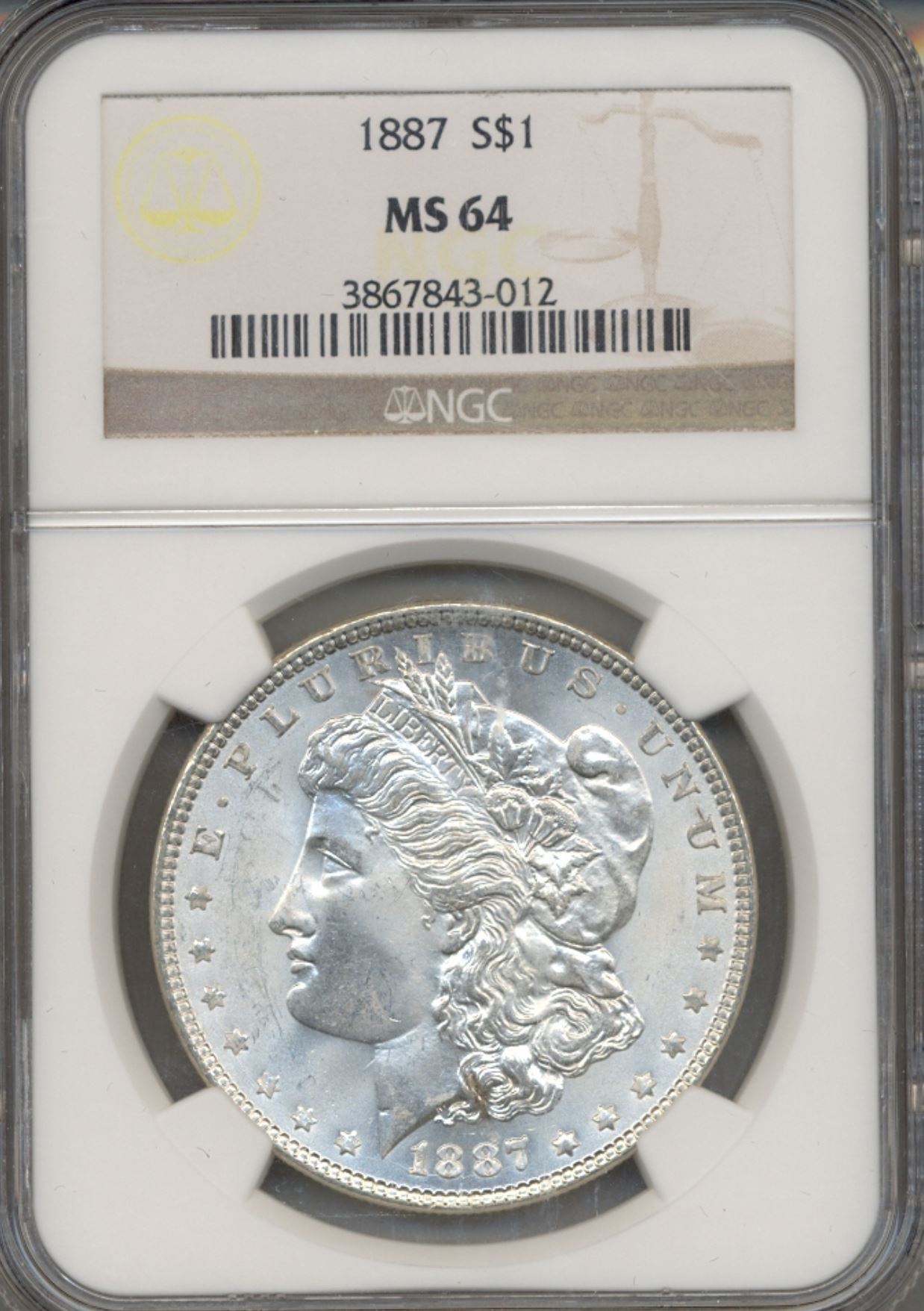 One 1887 $1 Morgan Silver Dollar Coin NGC MS64.