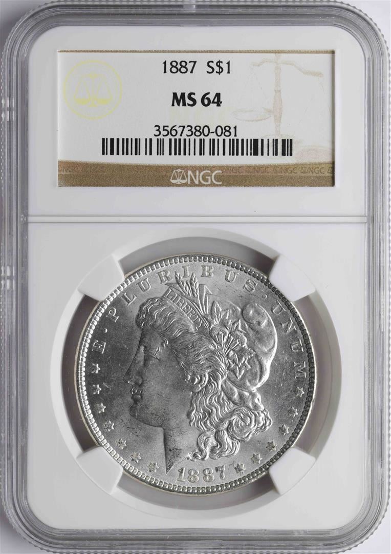 One 1887 $1 Morgan Silver Dollar Coin NGC MS64. NGC Certified.