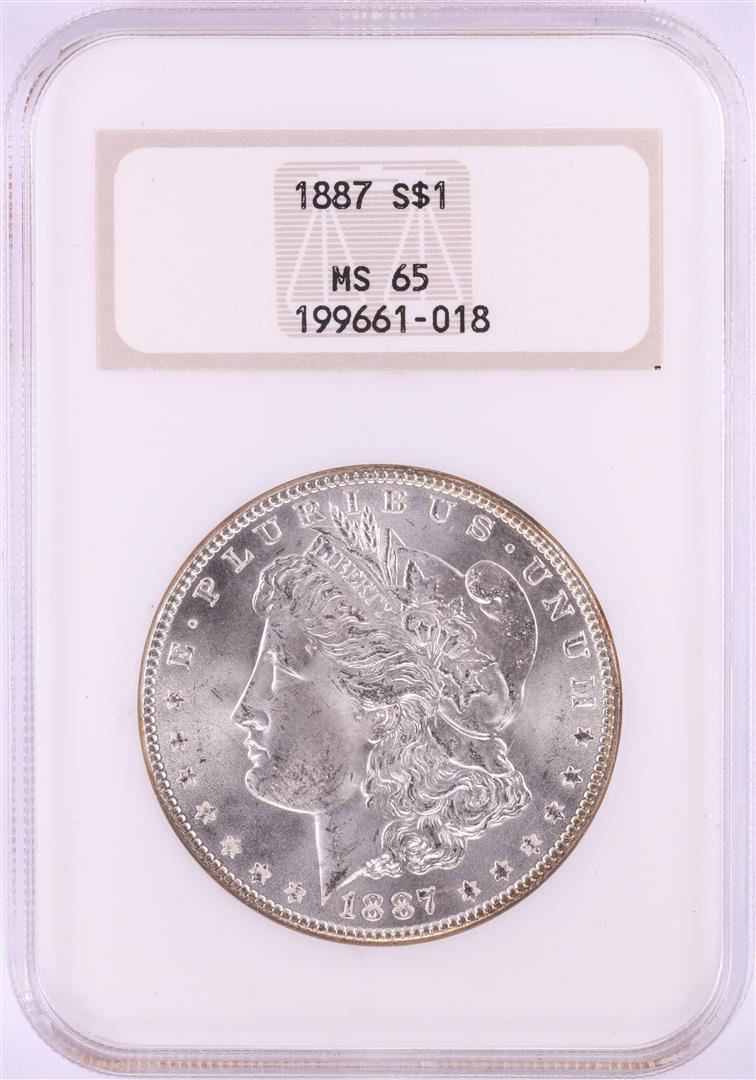 One 1887 $1 Morgan Silver Dollar Coin NGC MS65 Old Fatty Holder. NGC Certified.