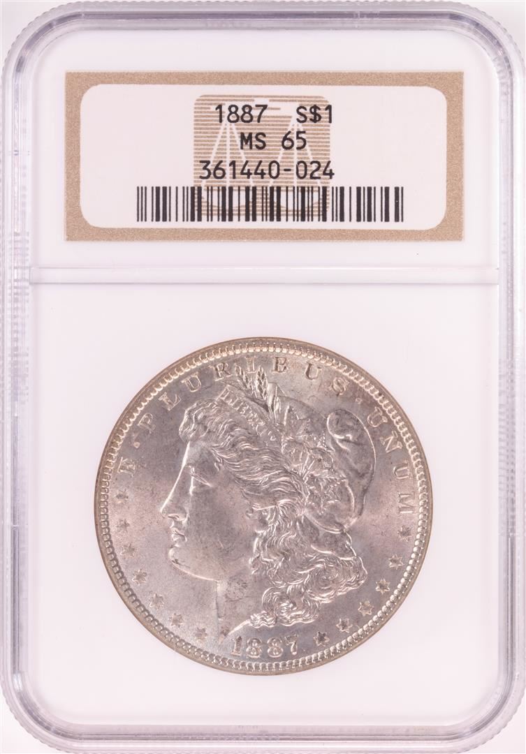 One 1887 $1 Morgan Silver Dollar Coin NGC MS65 Old Holder. NGC Certified.