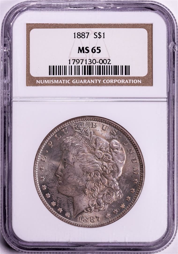 One 1887 $1 Morgan Silver Dollar Coin NGC MS65, please note the slab is chipped as shown in the picture. NGC Certified.