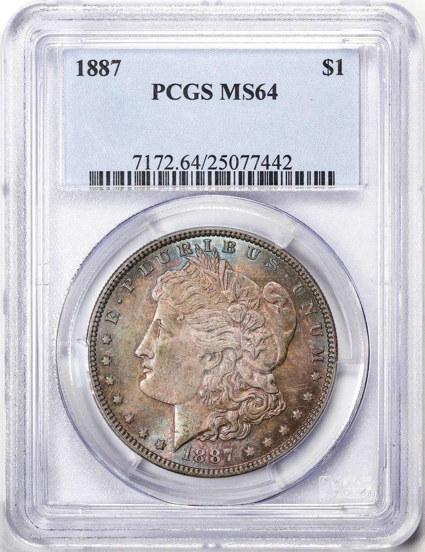 One 1887 $1 Morgan Silver Dollar Coin PCGS MS64 Great Toning. PCGS Graded.