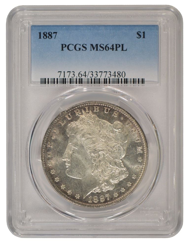 One 1887 $1 Morgan Silver Dollar Coin PCGS MS64PL.
