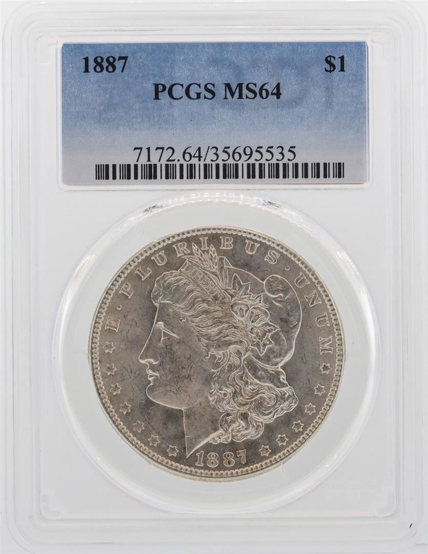 One 1887 $1 Morgan Silver Dollar Coin PCGS MS64. PCGS Certified.