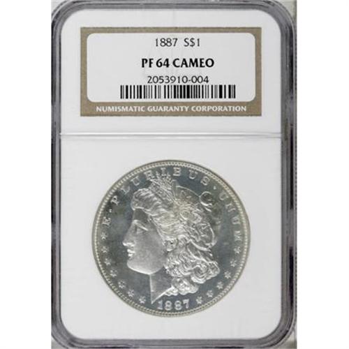 <B>1887 $1 PR64 Cameo NGC.</B></I> Wisps of yellow-gold cling to the borders and devices, but cameo frost is irrefutable on both major devices. The strike is razor-sharp on the eagle's breast, and the hair above the ear has virtually absolute detail. A scant 710 proofs were struck, 170 pieces fewer than the famous 1895.<BR><BR><b>Shipping:</b> Coins & Currency (<a target="_blank" href="http://www.heritageauctions.com/common/shipping.php">view shipping information</a>)