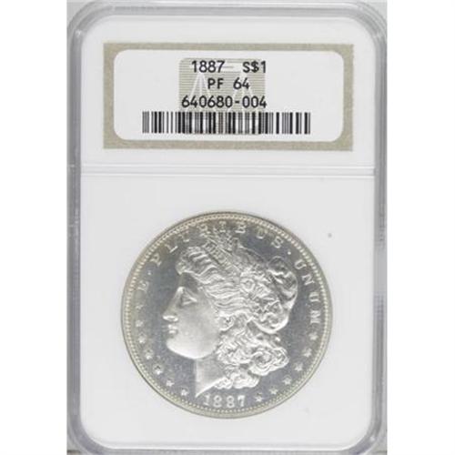 <B>1887 $1 PR64 NGC.</B></I> The peak of the 7 in the date is lightly repunched to the north. The watery fields are deeply reflective, and the striking details seem virtually unimprovable. Lightly toned with accents of pale green and gold. The mildly frosted devices allow an appreciable degree of field-to-device contrast on both sides. Free of contact marks and only faintly hairlined. <BR><I>From The Vanek Collection.</B></I><BR><BR><b>Shipping:</b> Coins & Currency (<a target="_blank" href="http://www.heritageauctions.com/common/shipping.php">view shipping information</a>)