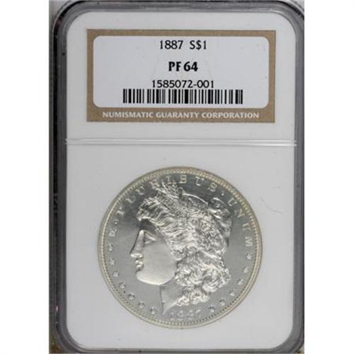 <B>1887 $1 PR64 NGC.</B></I> One of the more popular dates for proof type purposes in the Morgan dollar series. This is a well-produced date, struck before the weak strikes from the early 1890s. The fragile, glassy mirrors show a few light hairlines on the obverse, and the reverse appears to have been struck from a slightly granular planchet. Pinpoint striking details and brilliant throughout.<BR><BR><B>Coin Engraver:</B> George T. Morgan<BR><BR><b>Shipping:</b> Coins & Currency (<a target="_blank" href="http://www.heritageauctions.com/common/shipping.php">view shipping information</a>)