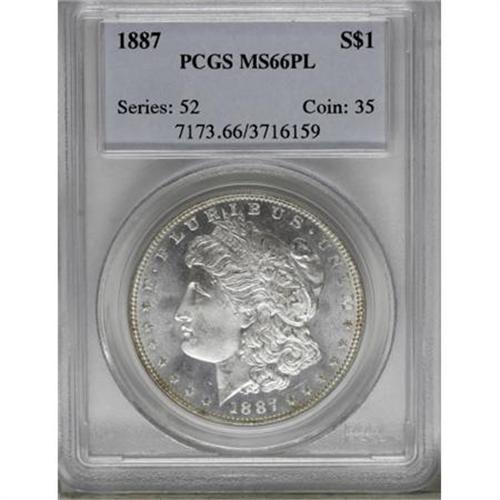 <B>1887 $1 MS66 Prooflike PCGS.</B></I> PCGS Population (40/3). NGC Census: (41/4). Numismedia Wsl. Price for NGC/PCGS coin in MS66: $444. (#7173)<BR><BR><B>Coin Engraver:</B> George T. Morgan<BR><BR><b>Shipping:</b> Coins & Currency (<a target="_blank" href="http://www.heritageauctions.com/common/shipping.php">view shipping information</a>)