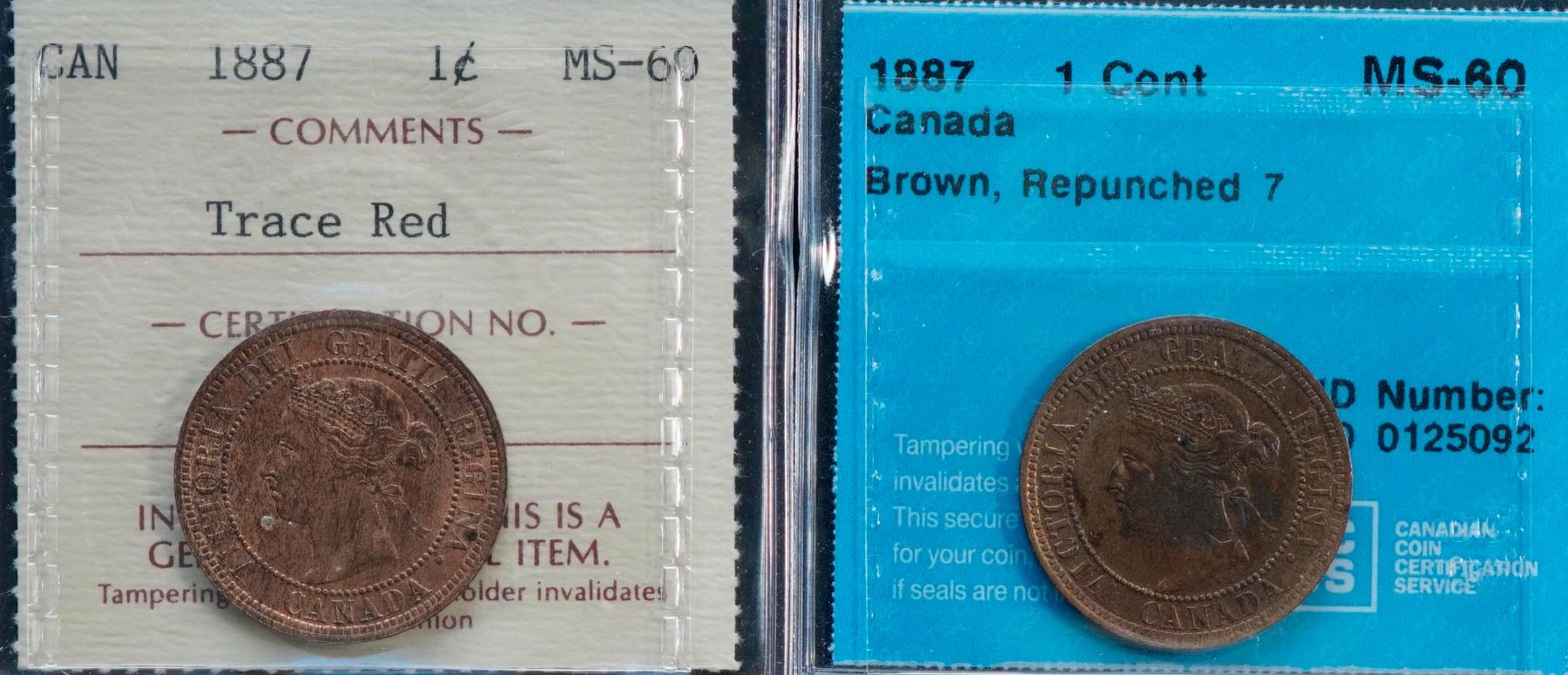 1887 1¢ Trace Red, & 1887 Repunched 7 BR both ICCS/CCCS Mint State-60 graded.