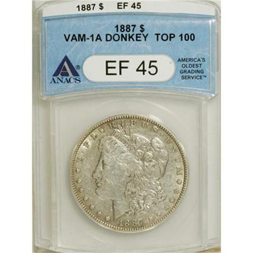 <B>1887 $1 Donkey XF45 ANACS.</B></I> VAM-1A, Top-100. NGC Census: (7/108617). PCGS Population (9/85213). Mintage: 20,290,710. Numismedia Wsl. Price for NGC/PCGS coin in XF45: $17. (#7172)<BR><BR><B>Coin Engraver:</B> George T. Morgan<BR><BR><b>Shipping:</b> Coins & Currency (<a target="_blank" href="http://www.heritageauctions.com/common/shipping.php">view shipping information</a>)