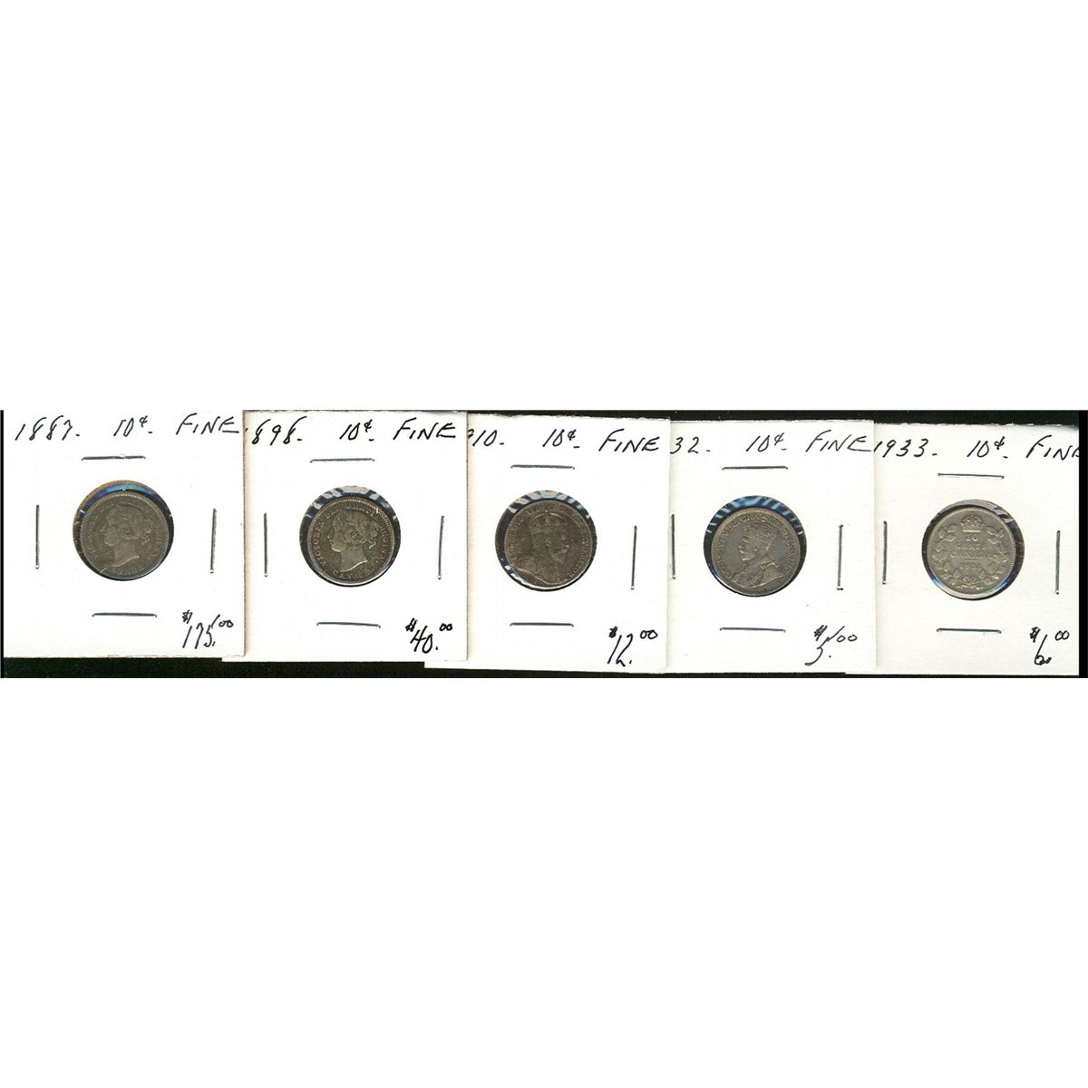1887 10¢, 1898, 1910, 1932 & 1933. Lot of 5 coins all Fine. (PBA).