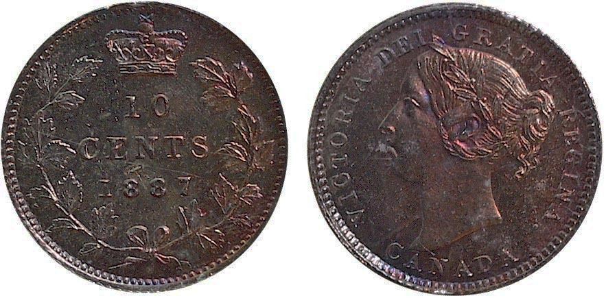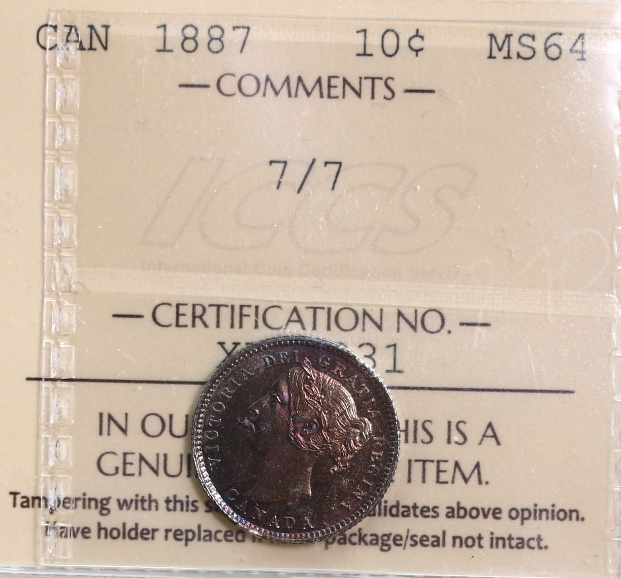 1887 10¢ "7/7" ICCS Choice Mint State-64. This is a Pristine issue with great eye appeal and superb fields. Among the nicest and Finest known examples. Worth a premium bid. This example may realize over estimate. This is an excellent and unbeatable opportunity for those who collect quality Ten Cents series, no other sales exist to compare this piece to.