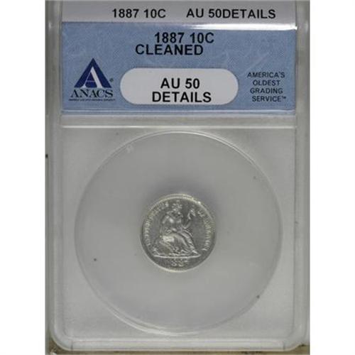 <B>1887 10C --Cleaned--ANACS. AU50 Details.</B></I> NGC Census: (1/417). PCGS Population (3/462). Mintage: 11,283,229. Numismedia Wsl. Price for NGC/PCGS coin in AU50: $63. (#4698)<BR><BR><B>Coin Engraver:</B> Christian Gobrecht<BR><BR><b>Shipping:</b> Coins & Currency (<a target="_blank" href="http://www.heritageauctions.com/common/shipping.php">view shipping information</a>)
