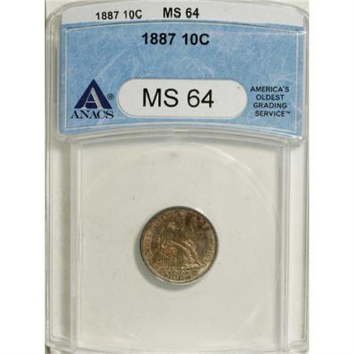 <B>1887 10C MS64 ANACS.</B></I> NGC Census: (130/108). PCGS Population (156/97). Mintage: 11,283,229. Numismedia Wsl. Price for NGC/PCGS coin in MS64: $320. (#4698)<BR><BR><B>Coin Engraver:</B> Christian Gobrecht<BR><BR><b>Shipping:</b> Coins & Currency (<a target="_blank" href="http://www.heritageauctions.com/common/shipping.php">view shipping information</a>)