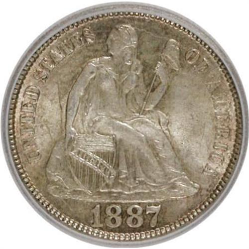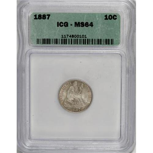<B>1887 10C MS64 ICG.</B></I> NGC Census: (128/105). PCGS Population (151/90). Mintage: 11,283,939. Numismedia Wsl. Price for NGC/PCGS coin in MS64: $320. (#4698)<BR><BR><B>Coin Engraver:</B> Christian Gobrecht<BR><BR><b>Shipping:</b> Coins & Currency (<a target="_blank" href="http://www.heritageauctions.com/common/shipping.php">view shipping information</a>)