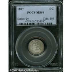 1887 10C MS64 PCGS. Gentle russet hues encroach up <B>1887 10C MS64 PCGS.</B></I> Gentle russet hues encroach upon the gunmetal-gray devices. This nicely struck piece has a few unimportant luster grazes in the right obverse field, but the eye appeal is substantial. <BR><BR><B>Important notice:</B> Heritage usually auctions material at the rate of 200-250 lots per hour. On some occasions eBay Live bid software or the Internet may not be able to keep up with the pace of the auction. We recommend placing a realistic absentee bid now as insurance to avoid disappointment. Occasionally the auctioneer may eliminate or reject an eBay Live bid, and the auctioneer may also reopen a lot after the close of the eBay live bidding (usually because we missed an audience bid), and may reject your bid even if it shows you as the winning bidder. By bidding via eBay Live, you agree that Heritage may award the lot to another bidder at its sole discretion under the circumstances described above or any other reasonable circumstances. Since eBay bids are not shown to us until we open the lot on the floor, we treat those bids just like floor bids. In most cases the floor responds before the eBay bid is presented to us, due to Internet lag time, so for consistency we have made it a policy that floor bids are always considered first over tie eBay live bids. Also please note that all Heritage lots purchased through eBay Live carry a 20% Buyer's Premium. Please make sure you read the Terms and Conditions before you bid. This lot is being auctioned in conjunction with a live floor auction by Heritage Galleries & Auctioneers. All final auction and invoice information will be supplied by Heritage Galleries & Auctioneers, and all other information should be considered preliminary. Lot:5735