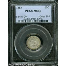 1887 10C MS64 PCGS. Original dove-gray and apricot <B>1887 10C MS64 PCGS.</B></I> Original dove-gray and apricot patina endows the obverse, while the reverse has a brilliant center and medium gold color about the margin. A lustrous and impressively unabraded near-Gem. <BR><BR><B>Important notice:</B> Heritage usually auctions material at the rate of 200-250 lots per hour. On some occasions eBay Live bid software or the Internet may not be able to keep up with the pace of the auction. We recommend placing a realistic absentee bid now as insurance to avoid disappointment. Occasionally the auctioneer may eliminate or reject an eBay Live bid, and the auctioneer may also reopen a lot after the close of the eBay live bidding (usually because we missed an audience bid), and may reject your bid even if it shows you as the winning bidder. By bidding via eBay Live, you agree that Heritage may award the lot to another bidder at its sole discretion under the circumstances described above or any other reasonable circumstances. Since eBay bids are not shown to us until we open the lot on the floor, we treat those bids just like floor bids. In most cases the floor responds before the eBay bid is presented to us, due to Internet lag time, so for consistency we have made it a policy that floor bids are always considered first over tie eBay live bids. Also please note that all Heritage lots purchased through eBay Live carry a 20% Buyer's Premium. Please make sure you read the Terms and Conditions before you bid. This lot is being auctioned in conjunction with a live floor auction by Heritage Galleries & Auctioneers. All final auction and invoice information will be supplied by Heritage Galleries & Auctioneers, and all other information should be considered preliminary. Lot:5728