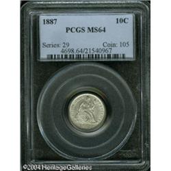 1887 10C MS64 PCGS. Potent luster sweeps across th <B>1887 10C MS64 PCGS.</B></I> Potent luster sweeps across this lightly toned silver-gray near-Gem. Meticulously struck, and nearly undisturbed by contact. An opportunity for the alert bidder. <BR><BR><B>Important notice:</B> Heritage usually auctions material at the rate of 200-250 lots per hour. On some occasions eBay Live bid software or the Internet may not be able to keep up with the pace of the auction. We recommend placing a realistic absentee bid now as insurance to avoid disappointment. Occasionally the auctioneer may eliminate or reject an eBay Live bid, and the auctioneer may also reopen a lot after the close of the eBay live bidding (usually because we missed an audience bid), and may reject your bid even if it shows you as the winning bidder. By bidding via eBay Live, you agree that Heritage may award the lot to another bidder at its sole discretion under the circumstances described above or any other reasonable circumstances. Since eBay bids are not shown to us until we open the lot on the floor, we treat those bids just like floor bids. In most cases the floor responds before the eBay bid is presented to us, due to Internet lag time, so for consistency we have made it a policy that floor bids are always considered first over tie eBay live bids. Also please note that all Heritage lots purchased through eBay Live carry a 20% Buyer's Premium. Please make sure you read the Terms and Conditions before you bid. This lot is being auctioned in conjunction with a live floor auction by Heritage Galleries & Auctioneers. All final auction and invoice information will be supplied by Heritage Galleries & Auctioneers, and all other information should be considered preliminary. Lot:5734