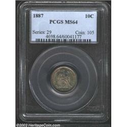 1887 10C MS64 PCGS. Well struck with excellent mint luster, both sides are covered with rich teal-green toning that is encircled by golden around the margins. Important notice: We expect to be auctioning lots at the rate of 200-250 per hour. Sometimes eBay Premier live bid software cannot keep up with that pace, so we strongly recommend that you place a realistic proxy bid now as insurance to avoid disappointment. Also please note that all Heritage/CAA lots purchased through eBay Premier carry a 20% Buyer's Premium. Please make sure you read the Terms and Conditions.