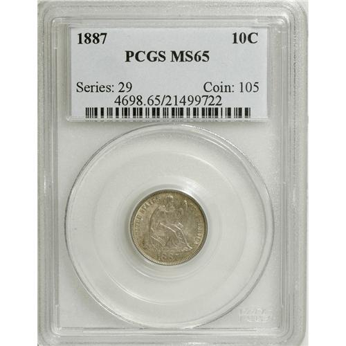 <B>1887 10C MS65 PCGS.</B></I> This is a lovely Gem with an admirable strike and a pleasingly high level of preservation. The lustrous surfaces are coated with pale rose and green toning on the obverse, while the much brighter reverse is untoned in the center and shows slight golden color near the border. Faint clash marks and a couple of minor blemishes are also observed on the reverse. Population: 68 in 65, 18 finer (2/07).<BR><BR><b>Shipping:</b> Coins & Currency (<a target="_blank" href="http://www.heritageauctions.com/common/shipping.php">view shipping information</a>)