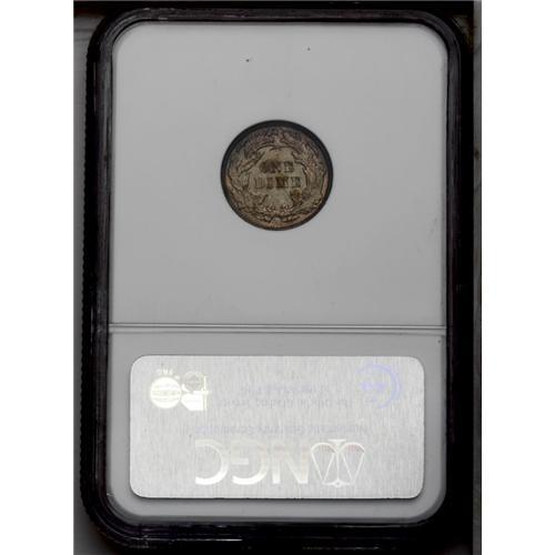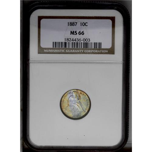<B>1887<10C> MS66 NGC.</B></I> A lovely Gem with satiny gray surfaces accented by bright olive-yellow color on two sides of the obverse. The reverse is enveloped in rose and greenish-gold color across the entire surface. Few finer quality examples of this date have been certified. Census: 39 in 66, 3 finer (3/06).