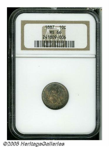 <B>1887<10C> MS66 NGC.</B></I> Lavish original toning and full, shimmering luster are hallmarks of this boldly struck Premium Gem. Well preserved and distraction-free, it would be difficult to find a more visually pleasing and technically impressive example. Population: 39 in 66, 6 finer (6/05).