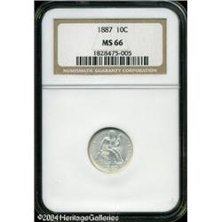 1887 10C MS66 NGC. This attractive, virtually whit <B>1887 10C MS66 NGC.</B></I> This attractive, virtually white specimen is well struck, except for minor softness in the upper reaches of the reverse wreath. Lustrous surfaces are virtually devoid of any significant marks. Population: 37 in 66, 8 finer (11/04). <BR><BR><B>Important notice:</B> Heritage usually auctions material at the rate of 200-250 lots per hour. On some occasions eBay Live bid software or the Internet may not be able to keep up with the pace of the auction. We recommend placing a realistic absentee bid now as insurance to avoid disappointment. Occasionally the auctioneer may eliminate or reject an eBay Live bid, and the auctioneer may also reopen a lot after the close of the eBay live bidding (usually because we missed an audience bid), and may reject your bid even if it shows you as the winning bidder. By bidding via eBay Live, you agree that Heritage may award the lot to another bidder at its sole discretion under the circumstances described above or any other reasonable circumstances. Since eBay bids are not shown to us until we open the lot on the floor, we treat those bids just like floor bids. In most cases the floor responds before the eBay bid is presented to us, due to Internet lag time, so for consistency we have made it a policy that floor bids are always considered first over tie eBay live bids. Also please note that all Heritage lots purchased through eBay Live carry a 20% Buyer's Premium. Please make sure you read the Terms and Conditions before you bid. This lot is being auctioned in conjunction with a live floor auction by Heritage Galleries & Auctioneers. All final auction and invoice information will be supplied by Heritage Galleries & Auctioneers, and all other information should be considered preliminary. Lot:5745