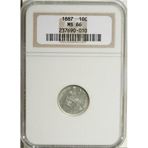 <B>1887 10C MS66 NGC.</B></I> This untoned and highly lustrous Premium Gem is free from abrasions, although a few faint die cracks and clash marks are present. Census: 45 in 66, 4 finer (8/07).<BR><BR><B>Coin Engraver:</B> Christian Gobrecht<BR><BR><b>Shipping:</b> Coins & Currency (<a target="_blank" href="http://www.heritageauctions.com/common/shipping.php">view shipping information</a>)