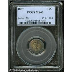 1887 10C MS66 PCGS. Cobalt-blue, gray, and lavende <B>1887 10C MS66 PCGS.</B></I> Cobalt-blue, gray, and lavender toning dances over lustrous surfaces. Well struck, except for the hair on Liberty's head and the bow knot. No major blemishes are apparent. Population: 16 in 66, 1 finer (10/04). <BR><BR><B>Important notice:</B> Heritage usually auctions material at the rate of 200-250 lots per hour. On some occasions eBay Live bid software or the Internet may not be able to keep up with the pace of the auction. We recommend placing a realistic absentee bid now as insurance to avoid disappointment. Occasionally the auctioneer may eliminate or reject an eBay Live bid, and the auctioneer may also reopen a lot after the close of the eBay live bidding (usually because we missed an audience bid), and may reject your bid even if it shows you as the winning bidder. By bidding via eBay Live, you agree that Heritage may award the lot to another bidder at its sole discretion under the circumstances described above or any other reasonable circumstances. Since eBay bids are not shown to us until we open the lot on the floor, we treat those bids just like floor bids. In most cases the floor responds before the eBay bid is presented to us, due to Internet lag time, so for consistency we have made it a policy that floor bids are always considered first over tie eBay live bids. Also please note that all Heritage lots purchased through eBay Live carry a 20% Buyer's Premium. Please make sure you read the Terms and Conditions before you bid. This lot is being auctioned in conjunction with a live floor auction by Heritage Galleries & Auctioneers. All final auction and invoice information will be supplied by Heritage Galleries & Auctioneers, and all other information should be considered preliminary. Lot:5744