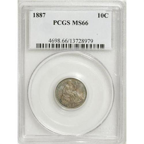 <B>1887 10C MS66 PCGS.</B></I> Both sides of this shining Premium Gem offer a measure of vivid blue-green patina, while the obverse also exhibits elements of violet and mauve. Sharply struck and eminently appealing, a delightful example of this later Seated dime issue. PCGS has graded a mere two finer pieces (10/07).<BR><BR><B>Coin Engraver:</B> Christian Gobrecht<BR><BR><b>Shipping:</b> Coins & Currency (<a target="_blank" href="http://www.heritageauctions.com/common/shipping.php">view shipping information</a>)