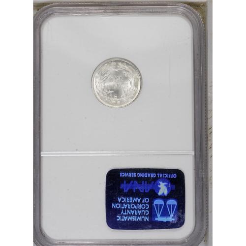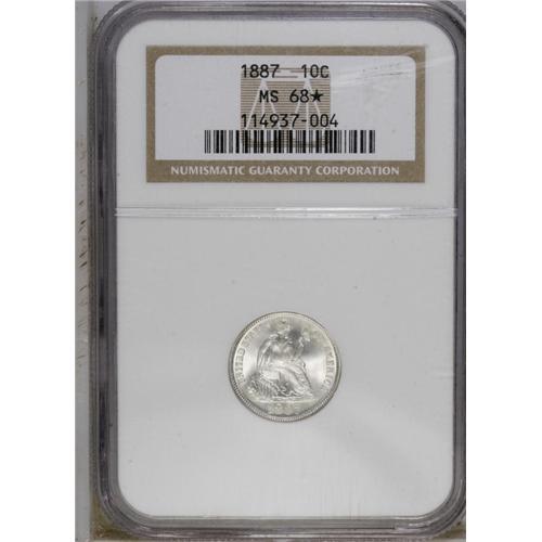 <B>1887<10C> MS68 <img border='0' src='http://www.heritagecoins.com/images/star.gif' width=10 height=10> NGC.</B></I> This is a common date in an absolute sense, a fact that should come as no surprise if one considers the original mintage figure of 11.2 million pieces. At this grade level, however, the 1887 is unique at the major grading services, and the present Superb Gem is also the only 1887 Dime that has been designated with a Star at NGC (8/06). Frosty-white in sheen, this undisturbed example does not reveal a single grade-limiting blemish. The overall striking definition is suitable, and the eye appeal is simply extraordinary. A coin for the collector who will settle for nothing but the best.