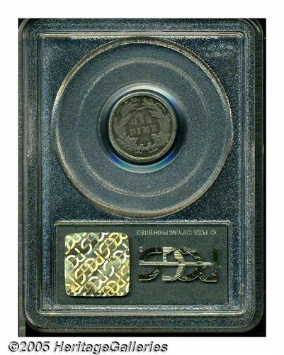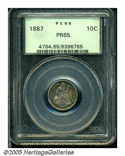 <B>1887<10C> PR65 PCGS.</B></I> The deep reflectivity in the proof fields is abundantly evident even through the multiple layers of toning that are present on each side. Rich purple and thalo-blue cover each side with lighter accents around the obverse margin.
