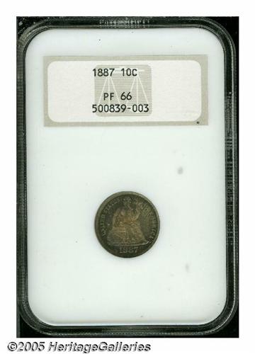 <B>1887<10C> PR66 NGC.</B></I> Cobalt-blue, lavender, and golden-brown patina is slightly more intense on the obvert. The design features re well impressed, and there are no significant marks. Population: 23 in 66, 6 finer (4/05).